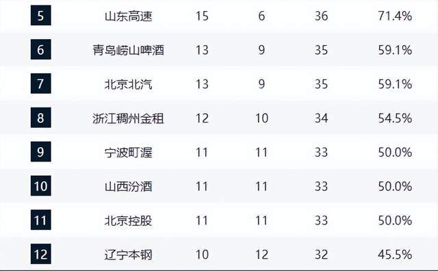 黑馬深圳與山東分列第四、第五,山東少賽一場但勝場占優,理論上排名第四。兩隊近期狀態火熱,10戰8勝,展現出強勁的競爭力。另一黑馬青島隊擊敗北京止住五連敗頹勢,排名第六;北京則遭遇兩連敗,排名下滑至第七,球隊磨合問題與主教練許利民的用人策略備受質疑。浙江隊雖位列第八,但本輪負於廣廈暴露瞭與頂級強隊的實力差距。