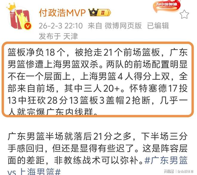 賽後,媒體人付政浩MVP社媒發文表示:籃板凈負18個,被搶走21個前場籃板,廣東男籃慘遭上海男籃雙殺。兩隊的前場配置明顯不在一個層面上,上海男籃4人得分上雙,全部來自前場,其中三人20+,懷特塞德28分15籃板3蓋帽2搶斷,幾乎一人就完爆廣東內線群……