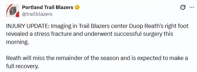 北京時間1月30日,開拓者官方更新傷情報告,杜普-裡斯的右腳影像檢查顯示存在應力性骨折,並已於當地時間今日上午成功接受手術。裡斯將缺席本賽季剩餘的所有比賽,預計可以完全康復。另外,據開拓者記者報道,亨德森和韋斯利已進入康復的最後階段,並且開始參與全隊對抗訓練。