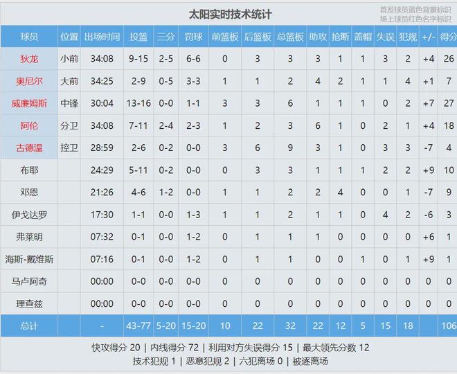 佈克和傑倫-格林因傷休戰,狄龍出戰34分8秒,15投9中,三分5中2,罰球6中6,砍下26分3籃板3助攻1搶斷1蓋帽3失誤,正負值+4。太陽中鋒馬威投籃15中13,罰球1中1,砍下27分6籃板1助攻1搶斷1蓋帽,正負值+7。