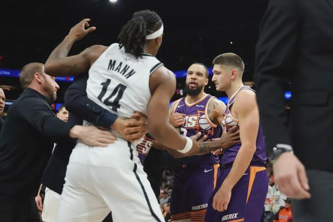北京時間1月28日,NBA常規賽:太陽主場106-102險勝籃網。第四節還剩1分18秒,雙方爆發沖突:多人倒地爭搶地板球,籃網新秀傑明將狄龍-佈魯克斯推倒。羅伊斯-奧尼爾推瞭一把傑明,曼恩又上前推奧尼爾,小波特也加入戰鬥。
