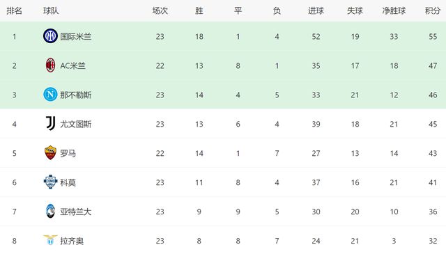 截至目前,國米在意甲已經一騎絕塵瞭。23輪過後,國米足足拿到55分,他們如今領先第二名的AC米蘭8分之多。哪怕接下來AC米蘭能夠在客場戰勝博洛尼亞,他們也沒有機會威脅國米的位置。從目前來看,意甲爭冠已經幾乎沒有懸念瞭,就國米虐菜的穩定性,他們奪冠隻剩下時間問題瞭。