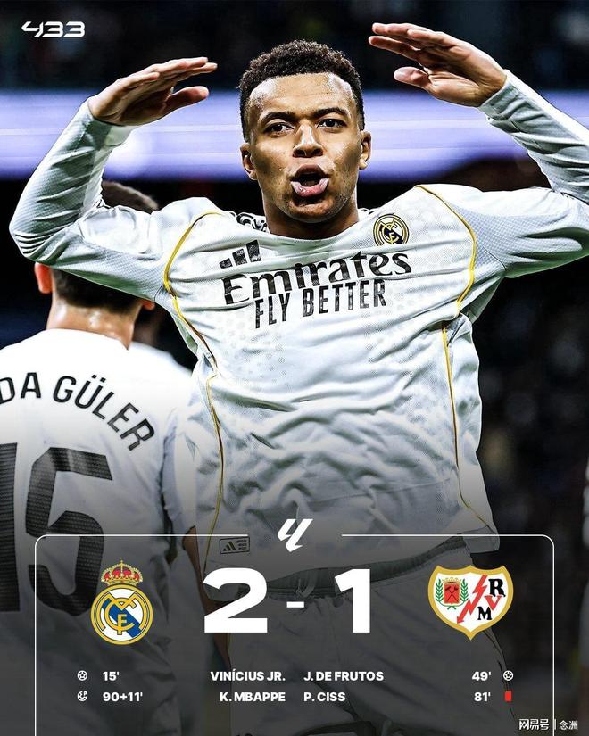 西甲第22轮,皇马主场2-1险胜九人巴列卡诺,取得联赛6连胜,距榜首巴萨1分。贝林厄姆伤退泪洒赛场,维尼修斯1V3破门+终结联赛13轮球荒,德弗鲁托斯扳平,库尔图瓦扑单刀,西斯蹬踏直红,姆巴佩失空门+读秒点射绝杀,查瓦利亚终场前染红。