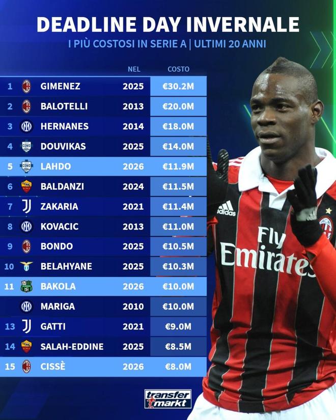 北京時間2月3日,德轉統計出瞭2006年以來意甲冬窗截止日最貴的15筆交易,AC米蘭2025年冬窗3020萬歐元引進聖地亞哥-希門尼斯排名第一,2013年AC米蘭2000萬歐元引進巴洛特利排名第二,國際米蘭2014年1800萬歐元引進埃爾納內斯第三。