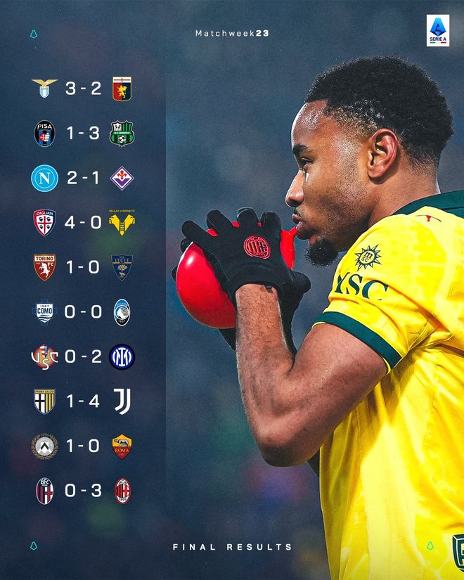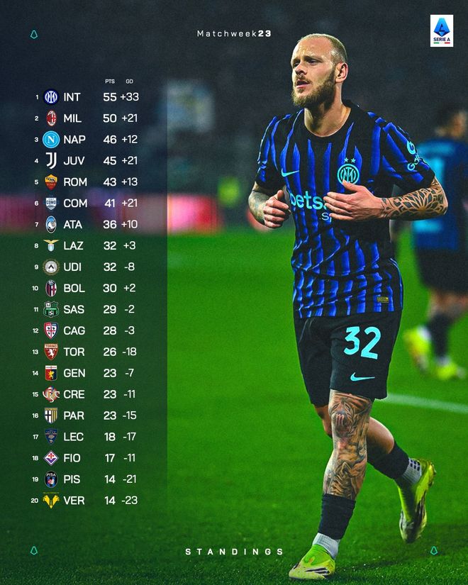 隨著今日凌晨AC米蘭3比0完勝博洛尼亞,意甲第23輪十場比賽全部結束。國際米蘭2比0小勝克雷莫納,繼續以五分優勢領跑聯賽積分榜,米蘭位列次席;那不勒斯2比1力克佛羅倫薩,仍位列歐冠區;羅馬客場1球負於烏迪內斯,將第四的名詞拱手相讓給本輪取得大捷的尤文圖斯,紅狼跌至歐聯席位區,科莫位列歐協聯附加賽區。