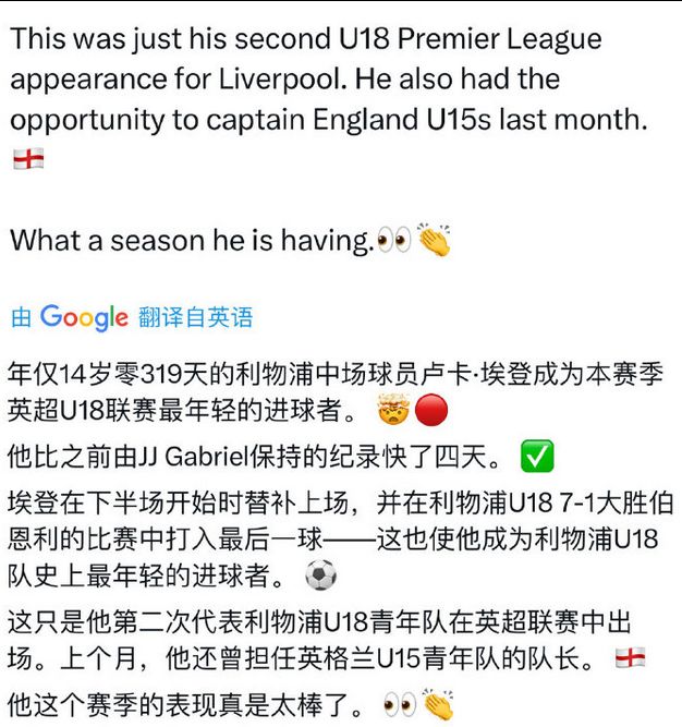 之前說到過,對比像曼城和切爾西甚至埃弗頓的尖子青訓球員,利物浦在過去很多年一直沒有身體很好的類型(這裡指一路梯隊上來的,然而實際上買到的小盆友們橫向對比也不算身體特別好)這次小埃登算是在身體和技巧端直接跳瞭好幾級。