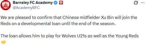 博主敖銘則表示,“徐彬既可以為巴恩斯利U21踢比賽,也可以為狼隊U21踢比賽,但僅限U21比賽,確實本賽季暫時是踢不上英甲聯賽的。狼隊的公告其實也是斟字酌句,不想引發國內球迷過度的期望。大傢還是冷靜一下吧,英超遙不可及。未來如果在某個賽季的足總杯,看到低級別球隊中有中國球員出場,那已經很棒瞭。”