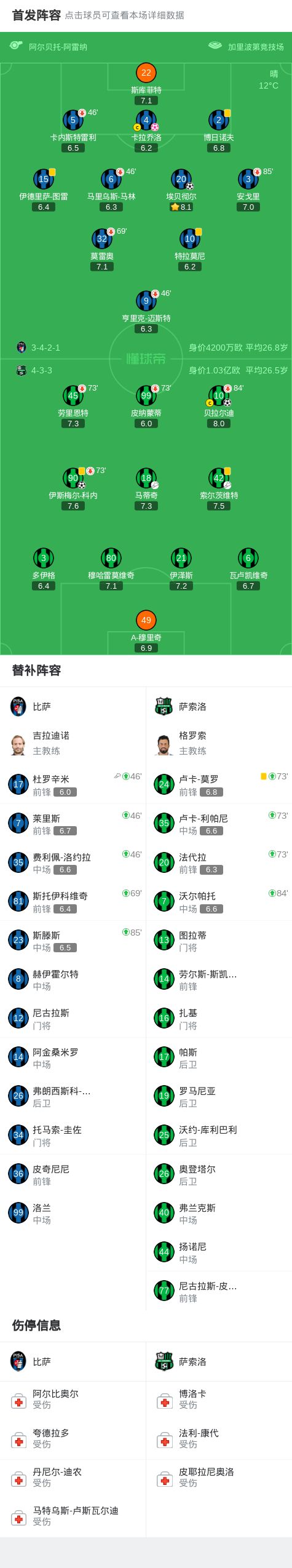 北京時間1月31日意大利足球頂級聯賽 聯賽 第23輪,比薩主場對陣薩索洛。比薩埃貝徹爾破門,卡拉喬洛自擺烏龍。薩索洛貝拉爾迪破門,伊斯梅爾-科內破門。最終比分比薩 1-3 薩索洛。