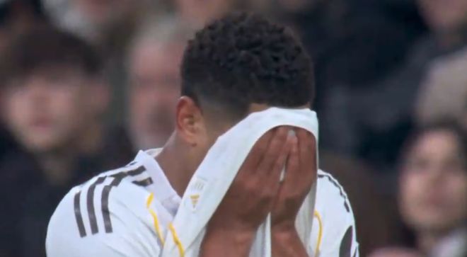 坐在草坪上的贝林厄姆泪流满面,姆巴佩向替补席示意他无法坚持。随后,贝林厄姆自己走下了球场,并且再次落泪,用球衣捂住了脸。