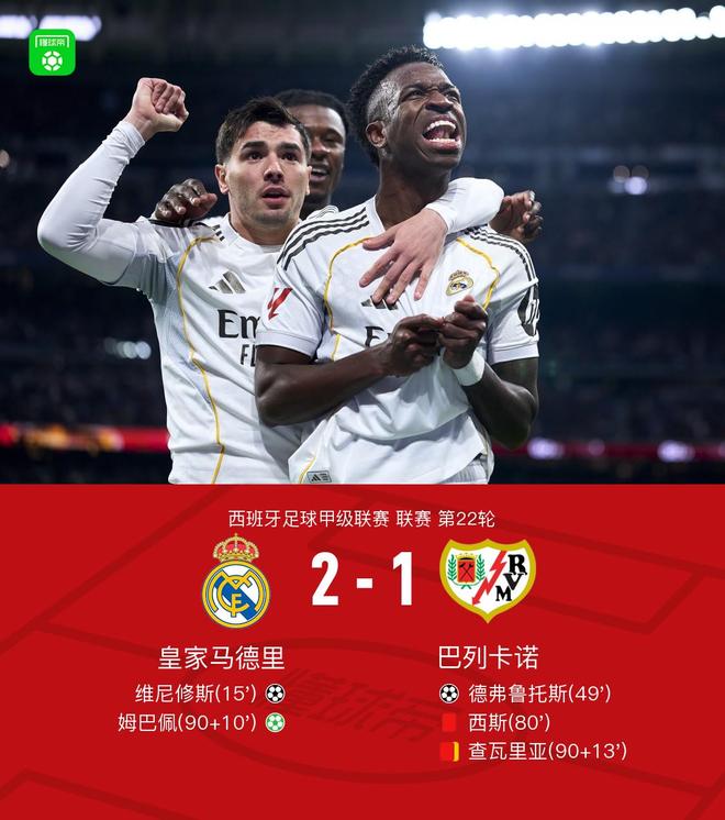 北京时间2月1日西班牙足球甲级联赛 联赛 第22轮,皇家马德里主场对阵巴列卡诺。皇家马德里维尼修斯破门,姆巴佩破门。巴列卡诺德弗鲁托斯破门。最终比分皇马 2-1 巴列卡诺。