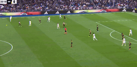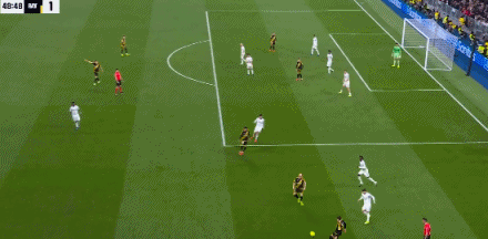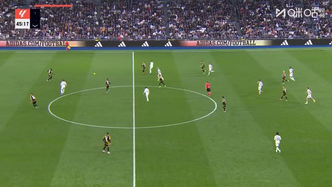 第46分钟,单后卫阵容,皇马场上正牌后卫仅赫伊森,楚阿梅尼撤回防线