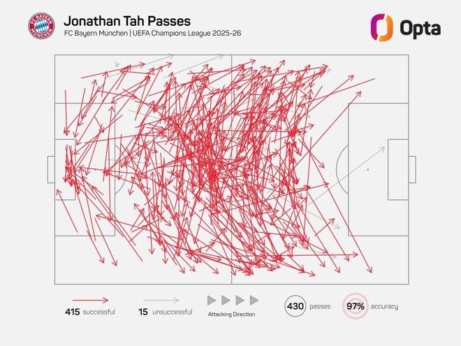 据Opta统计,约纳坦-塔本赛季欧冠至今尝试了430次传球,415次成功,15次失败,传球成功率高达97%,这位拜仁后卫是本赛季欧冠至今传球成功率最高的球员。