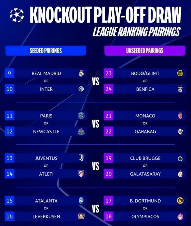 根据本赛季欧冠全新赛制,附加赛不再采用完全随机抽签,而是严格依据“联赛阶段”(即原小组赛)的最终排名进行配对:第9至16名球队为种子队,第17至24名为非种子队。种子队将在次回合坐镇主场,看似占据优势,但一旦首回合失手,次回合的压力将空前巨大。