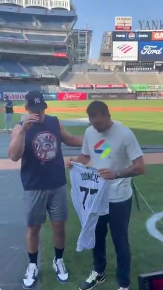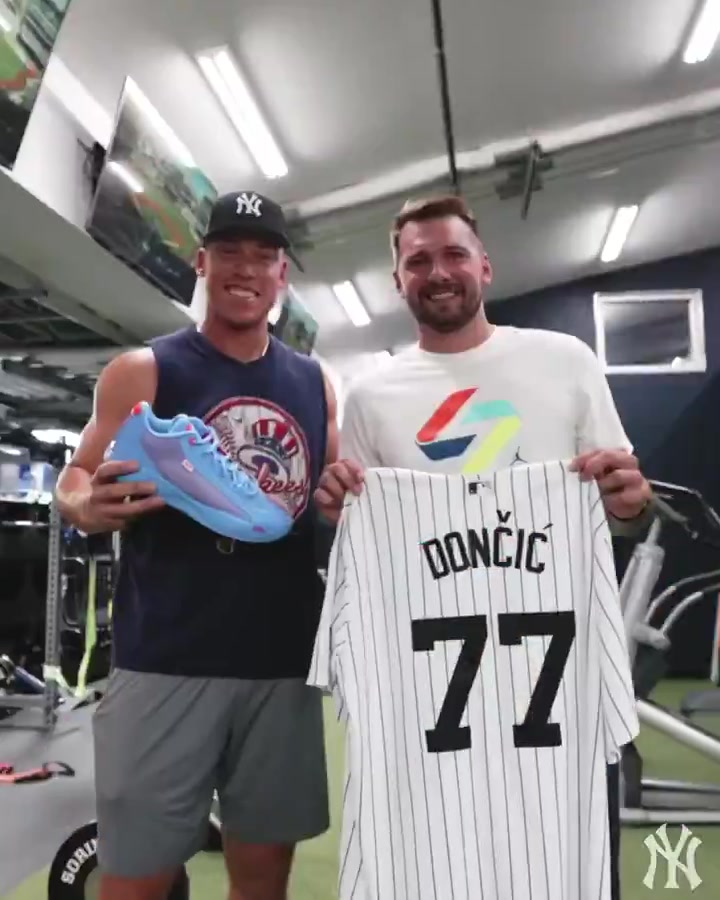 东契奇接过纽约洋基队球星阿隆-贾奇赠送的洋基队77号球衣