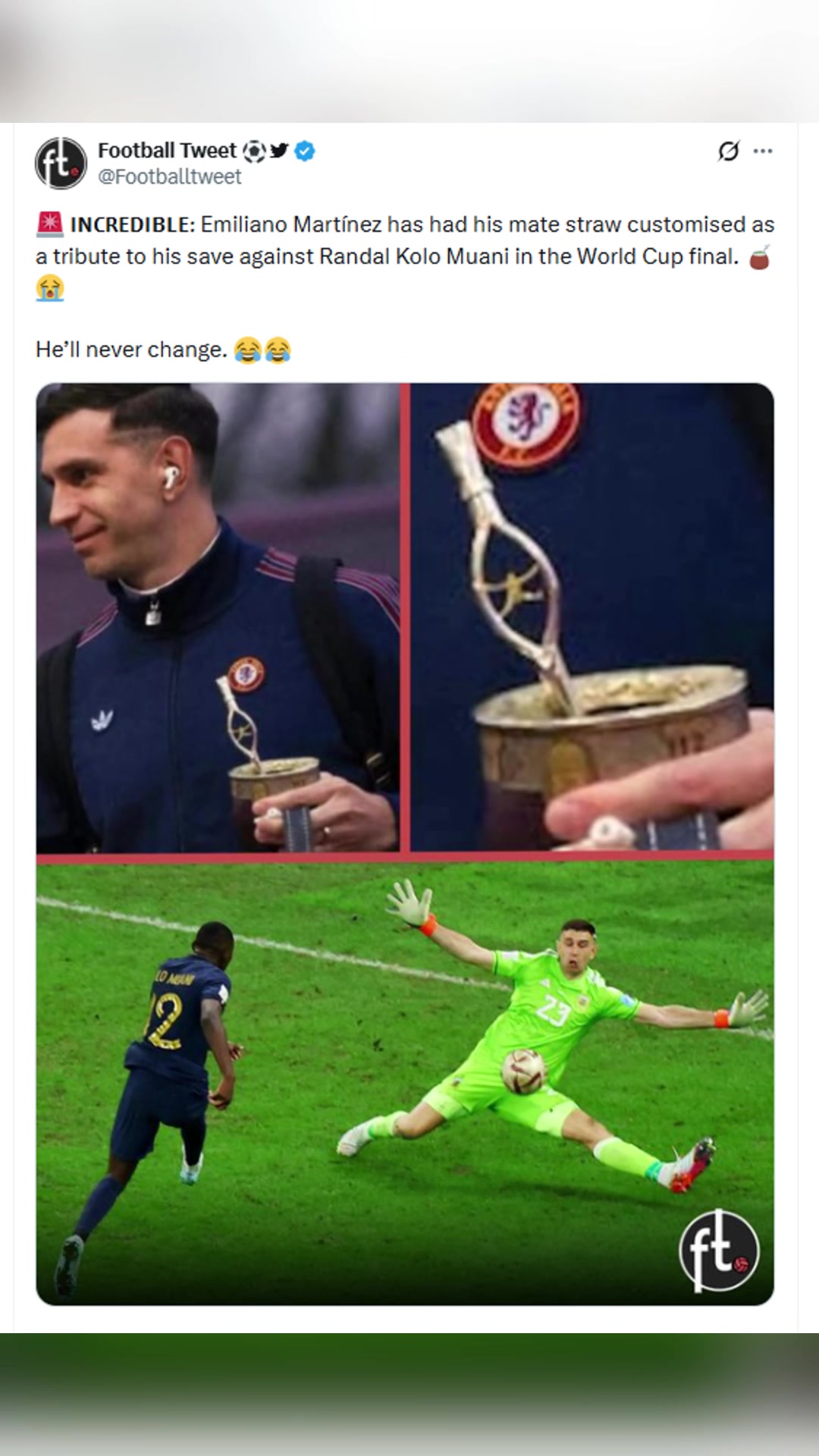 大马丁定制了一根马黛茶吸管纪念他在世界杯决赛中扑出单刀