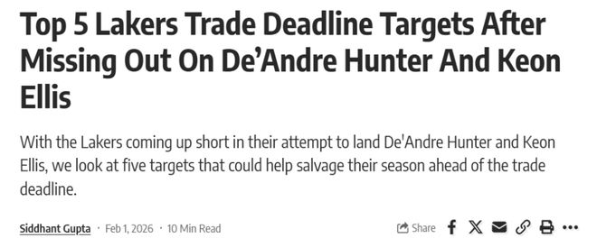 但無論原因如何,結果是湖人錯失兩大心儀目標,這筆交易達成後也讓紫金軍團後續補強前景變得再度模糊起來。