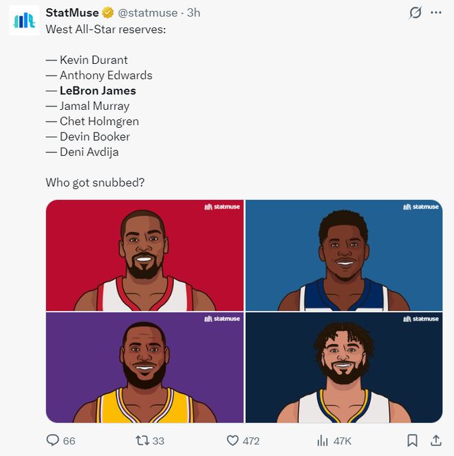 這場比賽之前,NBA官方宣佈瞭西部全明星替補:杜蘭特、華子、詹姆斯、穆雷、霍姆格倫、佈克、阿夫迪亞。換言之勒佈朗-詹姆斯連續22年入選全明星。