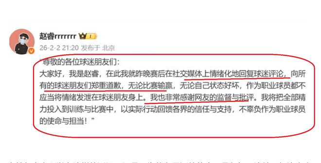 2月2日,晚上9點!北京隊球員趙睿,通過網絡平臺發文,正式向球迷進行道歉!