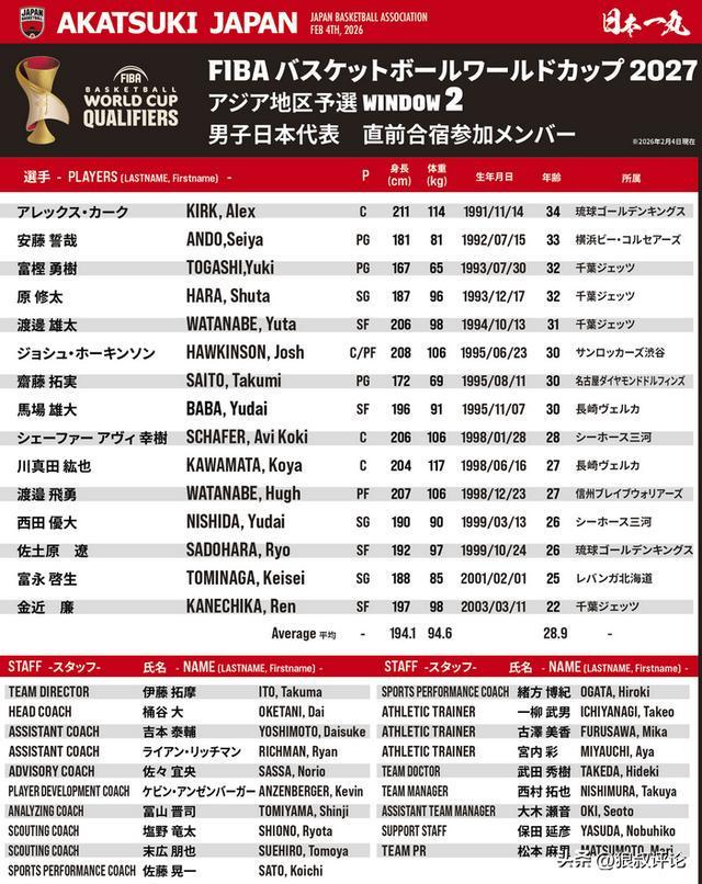 另外值得一註意的是日本男籃平均身高隻有1米94,平均年齡達到瞭28.9歲,大部分都是已經進入到成熟階段的運動員為主,從集訓時間可以看到大幅度減少,2月17日集結後,2月26日就主場迎戰中國男籃,僅僅一周多時間。