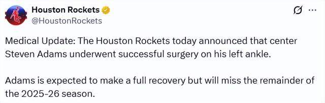 北京時間1月29日,據ESPN記者Shams報道,火箭隊中鋒史蒂文-亞當斯因左腳踝傷勢接受手術,將缺席2025-26賽季剩餘全部比賽。隨後,火箭官方宣佈瞭這一消息。亞當斯本人曬出術後病床照:一切都很順利,感謝你們所有的關心和祈禱。