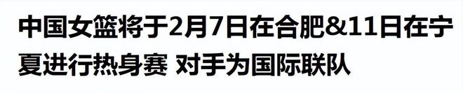 直播吧《中國女籃將於2月7日在合肥&11日在寧夏進行熱身賽 對手為國際聯隊》發佈時間:2026.1.16中國新聞網《中國女籃熱身賽(銀川站)2月11日開幕》發佈時間:2026.1.30武漢光電文體在線《官網更新中國女籃熱身賽名單 王思雨、張子宇在列》發佈時間:2026.2.3