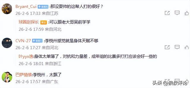 媒體人趙探長發文點評:在青年隊亂殺,但在一線隊還真得虛心一點,光耍帥不行。當然有潛質的年輕球員是要多打比賽,一點點摳他們比賽裡的問題。