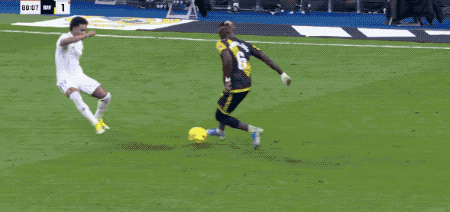 第15分钟,皇马打出快速反击,维尼修斯沿着左路进入禁区,以一敌三,兜射远角,打破僵局。