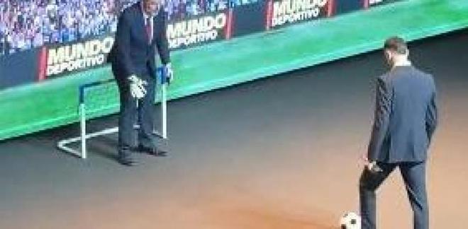 霍安-加西亚从英格列斯百货加泰罗尼亚区公关总监伊娃-弗兰克斯手中接过了奖杯,随后还上演了一幕别开生面的趣味环节。颁奖典礼的舞台上出现了一座标准尺寸的虚拟球门,在主持人霍尔迪-巴斯蒂的提议下,这座球门被立刻换成了迷你尺寸,他还向霍安-加西亚发起挑战,让这位门将站上点球点主罚,而自己则临时客串门将。