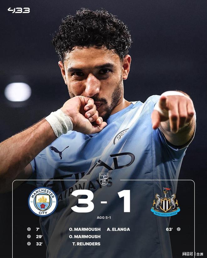 英格蘭聯賽杯半決賽次回合,曼城主場3-1紐卡斯爾,總比分5-1晉級決賽,將對陣阿森納。馬爾穆什梅開二度,賴因德斯破門,伊蘭加扳回一球。