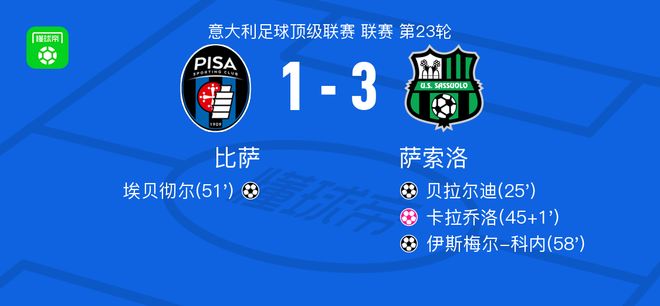 北京時間1月31日意大利足球頂級聯賽 聯賽 第23輪,比薩主場對陣薩索洛。比薩埃貝徹爾破門,卡拉喬洛自擺烏龍。薩索洛貝拉爾迪破門,伊斯梅爾-科內破門。最終比分比薩 1-3 薩索洛。