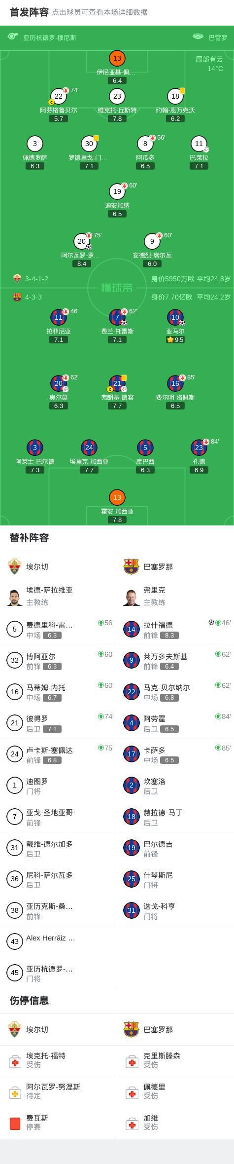 北京时间2月1日4:00,西甲第22轮继续进行,巴塞罗那作客巴莱罗球场挑战埃尔切,本场主裁判为亚历杭德罗-穆尼斯。上半场,奥尔莫助攻亚马尔闪击,阿尔瓦罗-罗德里格斯扳平比分,随后德容助攻费兰-托雷斯破门。下半场,拉什福德替补建功。巴萨本场七次错失绝佳机会。最终,巴萨3-1客胜埃尔切。