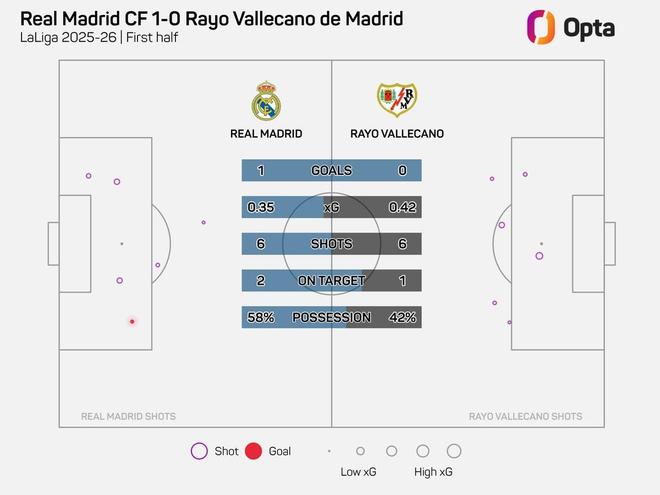 此役主场对阵巴列卡诺,皇家马德里在上半场完成6次射门,其中2次射正,由维尼修斯打入一球。