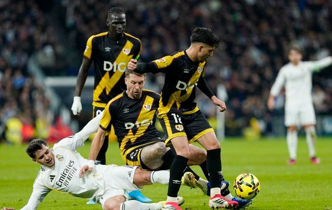 西甲第22轮的一场比赛展开争夺,皇马在主场迎战巴列卡诺。上半场,阿霍马克低射踢偏,维尼修斯兜射破门,居莱尔射门被扑出。下半场,德弗鲁托斯扳平比分,拉蒂乌浪费单刀机会,姆巴佩空门不进,西斯染红下场,姆巴佩第100分钟点射绝杀。最终,皇马2-1巴列卡诺。皇马落后巴萨1分,排名第2。