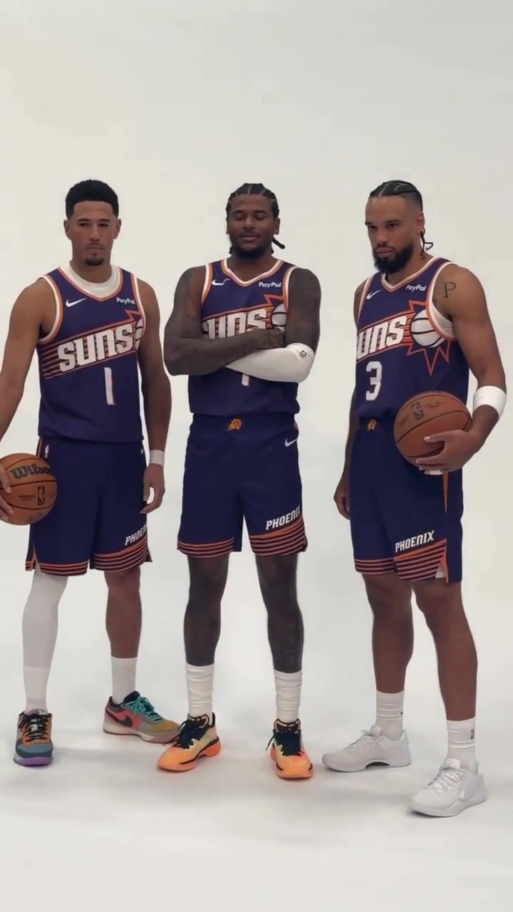 太阳队媒体日布克和两大新援杰伦格林狄龙布鲁克斯一起拍摄定妆照